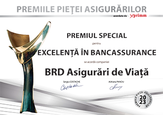 Premiul Special pentru “Excelență în Bancassurance”, oferit de către XPRIMM în cadrul Galei Premiilor Pieței Asigurărilor, din 24 august 2023, pentru întreaga activitate de bancassurance desfășurată de BRD Asigurări de Viață, ca rezultat al efortului de echipă și al unei colaborări strânse între entitățile grupului BRD, respectiv BRD GSG, BRD Asset Management, BRD Asigurări de Viață și BRD Asigurări Generale.