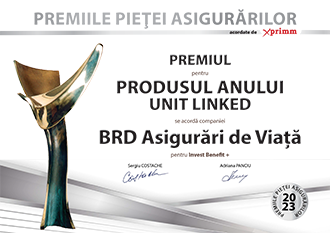 Premiul pentru “Produsul Anului Unit Linked”, acordat în cadrul Galei Premiilor Pieței Asigurărilor de XPRIMM Media, pentru asigurarea de viață cu componentă investițională Invest Benefit +. Acest produs este îmbunătățit permanent și oferă posibilitatea de a investi atât în EUR, cât și în RON, într-o gamă largă de fonduri de investiții furnizate de doi administratori de fonduri importanți pe piața națională și internațională: BRD Asset Management și Societe Generale Private Wealth Management și acum prezintă și o abordare sustenabilă, răspunzând cerințelor clienților privind investițiile în fonduri ESG.