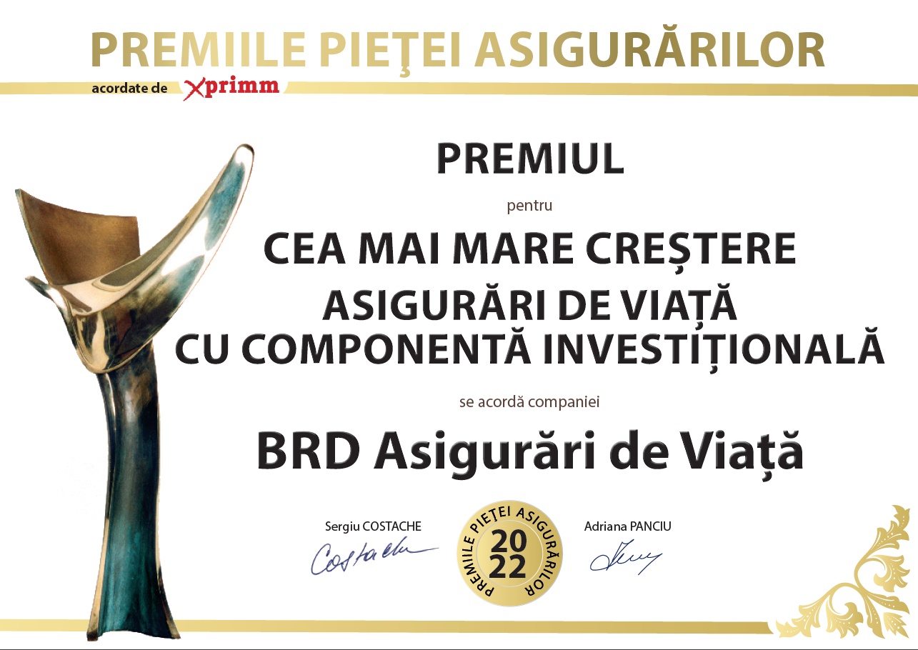 BRD Asigurări de Viață a fost premiată și anul acesta în cadrul Galei Premiilor Pieței Asigurărilor, care a avut loc în data de 25.08.2022, pentru Cea mai mare creștere pentru Asigurările de viață cu componentă investițională, respectiv EduPlan și Invest Benefit +.